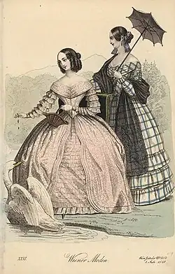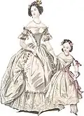 Sous l'influence anglaise, la silhouette féminine se simplifie : Le jour, on élimine les accessoires trop voyants pour ne conserver que l'essentiel, donnant à l'ensemble un aspect austère. Le buste étroit et busqué, une robe unie de couleur sombre, engoncée dans un châle-pèlerine, cachant son teint blafard sous une vaste capote, la femme à la mode s'efface désormais en société sous l'emprise du cant. On porte indifféremment des bandeaux plats ou des "anglaises", tire-bouchons de cheveux tombant sur les épaules. Le soir, on arbore le grand décolleté, volants et rubans de dentelles à la jupe gonflée de crin, fleurs et bijoux à profusion. Le chapeau est en forme de capote évasée du bas pour laisser tomber les longues boucles "à l'anglaise" puis la capote devient de plus en plus serrée sur les joues. Les bandeaux plats sont alors à la mode ; chez elles, les femmes portent de petits bonnets de lingerie ornés de dentelles et de rubans. Les robes se garnissent sur le côté, portées superposées et souvent ouvertes sur le devant en demi-queue arrondie parfois un peu traînante sur les robes de soirées. Les robes à volants, inspirées de la mode espagnole se portent jusque dans les années 1860 dans la rue ou au spectacle comme les mantilles et les grands châles. Les bottines lacées commencent à faire leur apparition. Le corsage se porte tombant sur les épaules grâce à une emmanchure très basse. Le corset aplatit la poitrine, allonge et amincit la taille. Le soir, les femmes exposent généreusement poitrine et épaules. Se dégage de la silhouette générale une impression de fragilité et de mystère que dramatise le port de couleurs sombres.