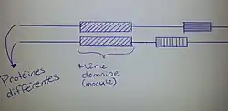 - Tout d'abord, le cas où tous les domaines sont des modules. Certains modules peuvent être homologues, mais la protéine ne l'est pas dans tous les cas. Voici une image pour aider à visualiser ce concept[11].