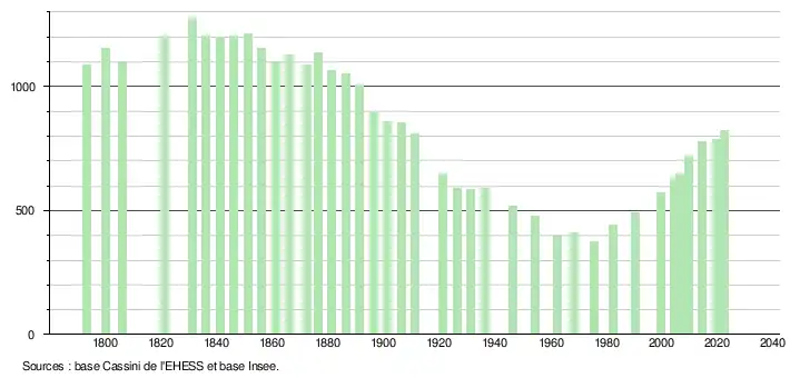 L'évolution du nombre d'habitants est connue à travers les recensements de la population effectués dans la commune depuis 1793. Pour les communes de moins de 10 000 habitants, une enquête de recensement portant sur toute la population est réalisée tous les cinq ans, les populations de référence des années intermédiaires étant quant à elles estimées par interpolation ou extrapolation[16]. Pour la commune, le premier recensement exhaustif entrant dans le cadre du nouveau dispositif a été réalisé en 2004[17].