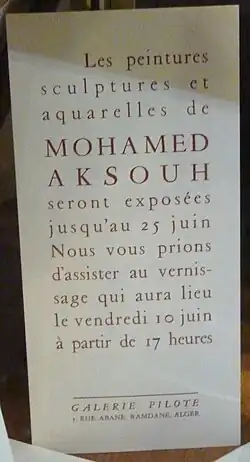 - ↑ L'exposition, préfacée par Jean Sénac[5], réunit des peintures d'Aksouh, Baya, Hacène Benaboura, Benanteur, Bouzid, Guermaz, Issiakhem, Khadda, Azouaou Mammeri, Mesli, Martinez, Mohamed Racim, Bachir Yellès, Zérarti, mais aussi d'Angel Diaz-Ojeda, Jean de Maisonseul, Nallard et René Sintès, ainsi que des dessins d'enfants[6].