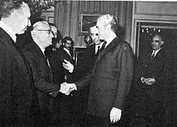 À côté de cela, le Shah arrange les relations de la monarchie avec le clergé, tenu loin du pouvoir depuis les réformes de Reza Chah, qui les considérait comme des obstacles à la modernité, et invite à rentrer en Iran l'ayatollah Kazem Shariatmadari, bientôt figure nationale du chiisme éminemment respectée, puis le Grand Ayatollah (Marja-e Taqlid) Seyyed Hossein Boroudjerdi, qui lui fera figure de grand nom du chiisme duodécimain à l'international[50]. Ses relations se tendront cependant vite avec l'ayatollah Kachani du fait de l'obscure implication de ce dernier dans l'attentat contre sa personne le , et qui sera expulsé au Liban.