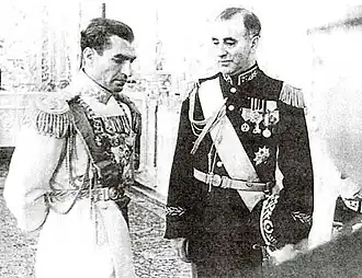 En outre, toujours pendant la Guerre, le Shah rencontre un autre invité de marque : Charles de Gaulle, qui, en route pour Moscou, fait halte à Téhéran le ; l'Iran a rompu ses relations avec le régime de Vichy en 1942, et le général de Gaulle admire beaucoup l'élégance diplomatique du Shah qui l'a reçu, en même temps que la Perse et son histoire multi-millénaire, tandis que le Shah admire également beaucoup le général : c'est le début d'une entente cordiale entre les deux hommes, qui se retrouveront des années plus tard[A 15]. Ardéshir Zahédi note dans ses mémoires que le général de Gaulle deviendra un modèle pour le Shah, le même type de modèle que Mustafa Kemal avait été pour Reza Shah[35],[N 7].