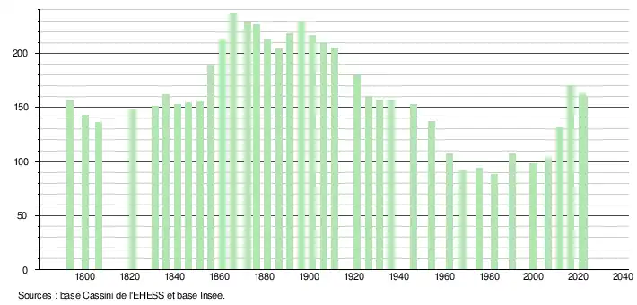 L'évolution du nombre d'habitants est connue à travers les recensements de la population effectués dans la commune depuis 1793. Pour les communes de moins de 10 000 habitants, une enquête de recensement portant sur toute la population est réalisée tous les cinq ans, les populations de référence des années intermédiaires étant quant à elles estimées par interpolation ou extrapolation[28]. Pour la commune, le premier recensement exhaustif entrant dans le cadre du nouveau dispositif a été réalisé en 2006[29].
