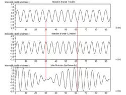 On voit donc que l'intensité résultante est composée d'une sinusoïde ayant une « fréquence spatiale » (nombre d'onde) élevée qui est la moyenne des fréquences spatiales des deux réseaux, et d'une sinusoïde ayant une fréquence spatiale faible qui est la moitié de la différence des fréquences spatiales des deux réseaux. Cette deuxième composante est une « enveloppe » pour l'autre sinusoïde. La longueur d'onde λ de cette composante est l'inverse de la fréquence spatiale