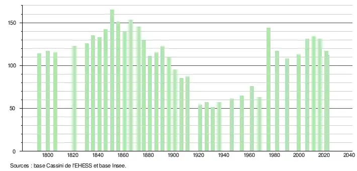 L'évolution du nombre d'habitants est connue à travers les recensements de la population effectués dans la commune depuis 1793. Pour les communes de moins de 10 000 habitants, une enquête de recensement portant sur toute la population est réalisée tous les cinq ans, les populations de référence des années intermédiaires étant quant à elles estimées par interpolation ou extrapolation[21]. Pour la commune, le premier recensement exhaustif entrant dans le cadre du nouveau dispositif a été réalisé en 2006[22].