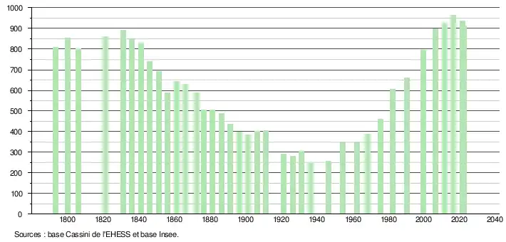 L'évolution du nombre d'habitants est connue à travers les recensements de la population effectués dans la commune depuis 1793. Pour les communes de moins de 10 000 habitants, une enquête de recensement portant sur toute la population est réalisée tous les cinq ans, les populations de référence des années intermédiaires étant quant à elles estimées par interpolation ou extrapolation[18]. Pour la commune, le premier recensement exhaustif entrant dans le cadre du nouveau dispositif a été réalisé en 2006[19].