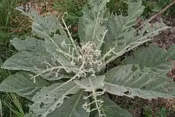 Sur les plantes fleuries, les feuilles sont alternes le long de la tige. Elles sont épaisses et décurrentes, avec de nombreuses variations dans la forme entre les feuilles supérieures et les feuilles inférieures de la tige, allant de oblongues à oblancéolées, et atteignant 50 cm de long et 14 cm de large[5]. Elles deviennent plus petites en haut de la tige, et moins fortement décurrentes vers le bas. La tige florale est solide, d'un diamètre compris entre 2 et 2,5 cm et, occasionnellement, ramifiée juste au-dessous de l'inflorescence[2], généralement à la suite de dommages (cassures…)[6]. Après la floraison et la libération des graines, la tige et les fruits persistent généralement en hiver après s'être desséchés. Les tiges sèches sont le plus souvent brun foncé, et persistent souvent jusqu'au printemps suivant, voire l'été suivant. La plante produit une racine pivotante peu profonde.