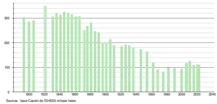 L'évolution du nombre d'habitants est connue à travers les recensements de la population effectués dans la commune depuis 1793. Pour les communes de moins de 10 000 habitants, une enquête de recensement portant sur toute la population est réalisée tous les cinq ans, les populations de référence des années intermédiaires étant quant à elles estimées par interpolation ou extrapolation[13]. Pour la commune, le premier recensement exhaustif entrant dans le cadre du nouveau dispositif a été réalisé en 2005[14].