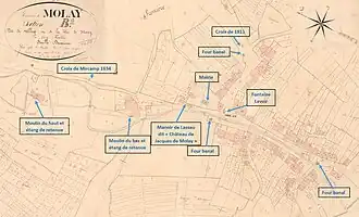 D'après le "Plan Napoléonien" (voir image ci-dessous) de 1835, le village est composé de 90 maisons dont un manoir (Ensemble de bâtiments datant du XVème ou XVIème siècle, appelé "Maison de Jacques de Molay" par les habitants par tradition orale), deux moulins à farine sur la Rigotte et trois fours à pain banaux pour 372 habitants.