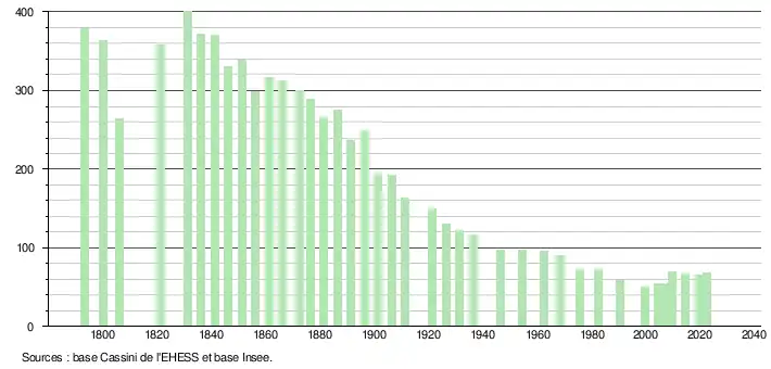 L'évolution du nombre d'habitants est connue à travers les recensements de la population effectués dans la commune depuis 1793. Pour les communes de moins de 10 000 habitants, une enquête de recensement portant sur toute la population est réalisée tous les cinq ans, les populations de référence des années intermédiaires étant quant à elles estimées par interpolation ou extrapolation[38]. Pour la commune, le premier recensement exhaustif entrant dans le cadre du nouveau dispositif a été réalisé en 2004[39].
