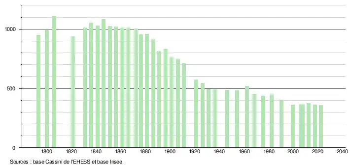 L'évolution du nombre d'habitants est connue à travers les recensements de la population effectués dans la commune depuis 1793. Pour les communes de moins de 10 000 habitants, une enquête de recensement portant sur toute la population est réalisée tous les cinq ans, les populations de référence des années intermédiaires étant quant à elles estimées par interpolation ou extrapolation[29]. Pour la commune, le premier recensement exhaustif entrant dans le cadre du nouveau dispositif a été réalisé en 2007[30].