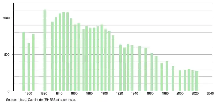 L'évolution du nombre d'habitants est connue à travers les recensements de la population effectués dans la commune depuis 1793. Pour les communes de moins de 10 000 habitants, une enquête de recensement portant sur toute la population est réalisée tous les cinq ans, les populations de référence des années intermédiaires étant quant à elles estimées par interpolation ou extrapolation[15]. Pour la commune, le premier recensement exhaustif entrant dans le cadre du nouveau dispositif a été réalisé en 2006[16].