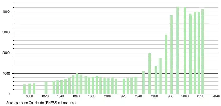L'évolution du nombre d'habitants est connue à travers les recensements de la population effectués dans la commune depuis 1793. Pour les communes de moins de 10 000 habitants, une enquête de recensement portant sur toute la population est réalisée tous les cinq ans, les populations de référence des années intermédiaires étant quant à elles estimées par interpolation ou extrapolation[25]. Pour la commune, le premier recensement exhaustif entrant dans le cadre du nouveau dispositif a été réalisé en 2007[26].