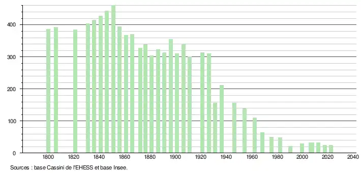 L'évolution du nombre d'habitants est connue à travers les recensements de la population effectués dans la commune depuis 1800. Pour les communes de moins de 10 000 habitants, une enquête de recensement portant sur toute la population est réalisée tous les cinq ans, les populations de référence des années intermédiaires étant quant à elles estimées par interpolation ou extrapolation[13]. Pour la commune, le premier recensement exhaustif entrant dans le cadre du nouveau dispositif a été réalisé en 2007[14].