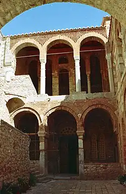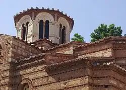 Vue de l’extérieur, l'église de la Panaghia peut être considérée comme un des meilleurs exemples que nous possédions de l’architecture décorative byzantine d’époque médiévale. Le chœur est formé de trois absidioles adoptant un tracé demi-hexagonal, en saillie sur la façade. Celle-ci présente un décor de moellons et de briques typiquement grec c’est-à-dire local[9]. Il est disposé en tranches alternées soulignées visuellement par des « cordons de dents » intercalés entre les assises horizontales, ce qui produit un élégant contraste entre la couleur claire des pierres lisses et le rouge des briques[10] ; les corniches dentelées en céramique et les frises de briques ornées de caractères coufiques apportent une note décorative soignée[11] ; les fenêtres simples géminées ou trilobées sont situées à des niveaux différents ; le jeu des volumes résulte de la variété des toits, à un ou deux versants[12]. La coupole à haut tambour octogonal en marbre orné de fenêtres bilobées, dont la partie supérieure a été reconstruite, s’élève avec élégance au-dessus de cet ensemble. Les motifs décoratifs sur les murs extérieurs de ce tambour sont uniques en leur genre en raison des arcs outrepassés, des tympans monolithes, des gargouilles  élément très rare en architecture byzantine  et du revêtement des murs droits par des plaques de marbre[13] ; sur ces plaques ont été appliqués des ornements en marqueterie avec des motifs de croix, d’arcs et de rinceaux[14]. Les parties sculptées sur le tympan de ces fenêtres étaient autrefois remplies de stuc noir, et le tympan lui-même était peint[15].