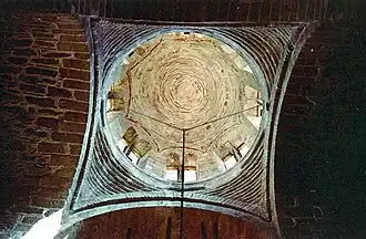 L'église a un plan en croix grecque surmonté d'une coupole de m de diamètre et d’une hauteur de 5,25 m. Son tambour comporte seize pans ornés de fenêtres. Cette coupole présente un caractère original : à l’intérieur, elle n’est pas soutenue par des colonnes, mais s’appuie sur huit piliers par l’intermédiaire de niches ou trompes d’angle[24], ce qui dégage un grand espace au cœur de l’église, dans le naos. Ces piliers sont disposés par couples, et reliés par les quatre trompes d’angle et quatre arcades. Le carré de base au centre du plan est ainsi entouré sur trois côtés par des galeries aux travées voûtées d’arêtes et surmontées de tribunes à l’étage supérieur[25]. Le plan octogonal de cette église principale est devenu une référence pour l'architecture byzantine tardive, et a été adopté en particulier au Monastère de Daphni et à l’église russe de Sotira Lykodimou à Athènes.