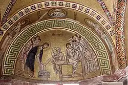 Au rez-de-chaussée, dans les chapelles latérales des absidioles, appelées du nom de leurs autels secondaires, prothèse et diaconicon[33], sont représentés trois thèmes importants de l’art paléochrétien, Trois Hébreux dans la fournaise, Daniel dans la fosse aux lions et Abraham et Melchisédech[25].