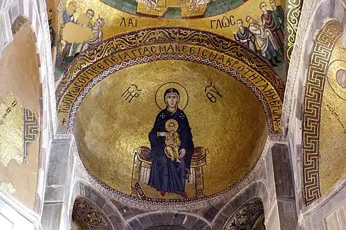 Dans la conque de l’abside centrale, se détache sur un fond d’or la grande figure de la Vierge trônant avec, sur ses genoux, l’Enfant, Sauveur du monde, qu’elle présente aux fidèles. Elle apparaît ainsi comme un trait d’union entre le ciel et la terre. Au-dessus, la Pentecôte, descente du Saint-Esprit sous la forme d’une langue de feu sur la tête des apôtres, est encadrée par les Tribus (Φίλαι) et les Langues (Γλῶσσαι).