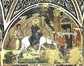 Sur la paroi nord, la scène de l’entrée de Jésus à Jérusalem est traitée avec toute la sobriété qui caractérise le style iconographique et la composition de l’art byzantin des Xe et XIe siècles. Au centre, Jésus monté sur un âne, est suivi d’un jeune disciple, probablement Philippe, vêtu d'un himation sous lequel on aperçoit le balancement des plis de son chiton[44]. À l’arrière-plan, un décor stylisé de montagne avec des rameaux éparpillés apporte une humble note végétale. À droite, devant la porte de Jérusalem, quatre dignitaires officiels accueillent le Christ, le plus âgé tendant une palme en sa direction. Un enfant étend au sol un vêtement rouge sur le passage de l’âne, tandis qu’un autre a grimpé sur le tronc d’un palmier pour mieux observer la scène. Les couleurs sobres et harmonieuses, le petit nombre de personnages, « le mouvement lent et cérémonieux de la scène traitée dans la tonalité grave que soulignent l’intensité des regards concourent à suggérer la joie vibrante des âmes[44]. »