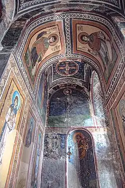 Le très dense et très riche décor de peintures murales, qui couvre les arcs, voûtes et voûtes d’arêtes, comporte plusieurs dizaines de médaillons représentant les douze apôtres, des saints et des moines, ainsi que onze scènes peintes sur les parois verticales, parmi lesquelles neuf ont été conservées bien qu’endommagées. Elles figurent, entre autres, l’Incrédulité de Thomas, la Crucifixion, l’Assomption, la Descente de croix et la Mise au tombeau[43]. Ces peintures peuvent être datées du premier quart du XIe siècle.