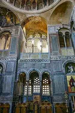 On trouve aussi dans le narthex les mosaïques du Lavement des pieds et de l’Incrédulité de Thomas. Les artistes qui ont exécuté les mosaïques ont donné une place d’honneur à de très nombreux saints populaires et locaux, en particulier des saints monastiques et militaires, qui évoquent la période de luttes acharnées auxquelles l’Empire byzantin dut faire face ; l’esprit monastique se manifeste aussi dans le magnifique ensemble de portraits d’ascètes et de saints fondateurs de la foi orthodoxe, parmi lesquels saint Basile, saint Jean Chrysostome et saint Grégoire le Thaumaturge[32].