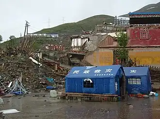 Le tremblement de terre a frappé le 14 avril 2010 et a enregistré une magnitude de 6,9 Mw[7],[8] (USGS , EMSC) ou 7,1 Ms[9],[10] (CEA , CENC). Il est apparu à Yushu, Qinghai, Chine, à 7h49 heure locale[11],[12]. Selon l' agence de presse Xinhua, 2 698 personnes ont été confirmées mortes, 270 disparues et 12 135 blessées dont 1 434 gravement blessées[13]. L' épicentre était situé dans le village de Rima (日玛村/日麻村), canton supérieur de Laxiu (上拉秀乡) du comté de Yushu[14],[15], sur un terrain reculé et accidenté, près de la frontière de la région autonome du Tibet . L'épicentre est à environ 30 km de la ville de Jyekundo ou Gyêgu, siège du comté de Yushu[16], et à environ 240 km de Qamdo[7]. L'épicentre se trouvait dans une zone peu peuplée du plateau tibétain qui est régulièrement frappée par des tremblements de terre[17].