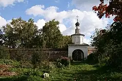 La construction la plus intéressante du monastère est celle des Saintes-Portes avec leurs deux clochers pyramidaux, érigées en 1688 [2]. Les portes, avec leurs deux grandes arcades de tailles différentes, sont garnies de sculptures en pierre, de rangées de chirinki garnis de faïences. L'arc principal a presque la forme d'un demi-cercle, le plus petit est recouvert sous son arc par de légers bossages. Les arcs sont surmontés par deux coupoles en forme de tente octogonales, sur les pans desquelles sont posées de petites fausses-lucarnes. Le petit tambour à la base des coupoles est garni de petites fenêtres et de caissons. La couleur utilisée pour l'édifice a souvent varié au cours des siècles.