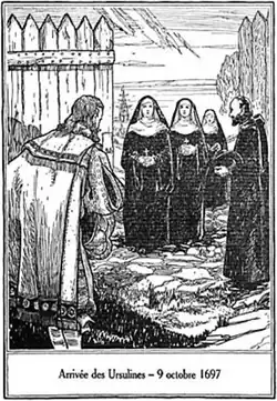 C’est le que trois religieuses Ursulines de Québec arrivent à Trois-Rivières par voie d’eau, à bord d’un brigantin appartenant au gouverneur[3]. Il s’agit de Marie Drouet de Jésus, supérieure, Mère Marie Le Vaillant de Sainte-Cécile et de Sœur Françoise Gravel de Sainte-Anne. Deux autres religieuses arriveront quelques jours plus tard. Il s’agit de Mère Marie Drouard de Saint-Michel et Marie-Madeleine Amiot de la Conception. Au départ, les Ursulines enseignent aux Amérindiennes et aux Françaises des familles Hertel, Leneuf, Boucher, Poulin de Courval et Tonnancourt.