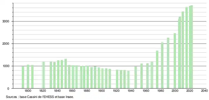 L'évolution du nombre d'habitants est connue à travers les recensements de la population effectués dans la commune depuis 1793. Pour les communes de moins de 10 000 habitants, une enquête de recensement portant sur toute la population est réalisée tous les cinq ans, les populations de référence des années intermédiaires étant quant à elles estimées par interpolation ou extrapolation[22]. Pour la commune, le premier recensement exhaustif entrant dans le cadre du nouveau dispositif a été réalisé en 2005[23].
