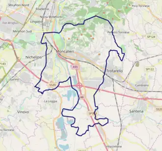 La ville de Moncalieri est située au sud de celle de Turin et traversée par le 45e parallèle. Son territoire de 47 km2 s'étend pour partie sur la plaine du Pô à l'ouest et est arrosé également par ses affluents que sont le Sangone et la Chisola. À l'est, les autres quartiers de Moncalieri s'étagent sur une zone de collines.