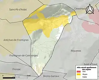 Le retrait-gonflement des sols argileux est susceptible d'engendrer des dommages importants aux bâtiments en cas d’alternance de périodes de sécheresse et de pluie. 34,3 % de la superficie communale est en aléa moyen ou fort (88,8 % au niveau départemental et 48,5 % au niveau national). Sur les 63 bâtiments dénombrés sur la commune en 2019, 63 sont en aléa moyen ou fort, soit 100 %, à comparer aux 98 % au niveau départemental et 54 % au niveau national. Une cartographie de l'exposition du territoire national au retrait gonflement des sols argileux est disponible sur le site du BRGM[31],[Carte 3].
