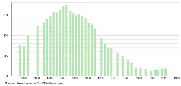 | L'évolution du nombre d'habitants est connue à travers les recensements de la population effectués dans la commune depuis 1793. Pour les communes de moins de 10 000 habitants, une enquête de recensement portant sur toute la population est réalisée tous les cinq ans, les populations de référence des années intermédiaires étant quant à elles estimées par interpolation ou extrapolation[36]. Pour la commune, le premier recensement exhaustif entrant dans le cadre du nouveau dispositif a été réalisé en 2005[37]. En 2022, la commune comptait 36 habitants[Note 5], en évolution de −5,26 % par rapport à 2016 (Haute-Garonne : +8,02 %, France hors Mayotte : +2,11 %). |