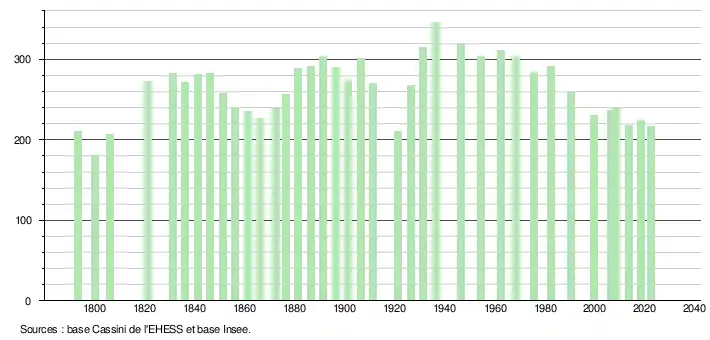 L'évolution du nombre d'habitants est connue à travers les recensements de la population effectués dans la commune depuis 1793. Pour les communes de moins de 10 000 habitants, une enquête de recensement portant sur toute la population est réalisée tous les cinq ans, les populations de référence des années intermédiaires étant quant à elles estimées par interpolation ou extrapolation[23]. Pour la commune, le premier recensement exhaustif entrant dans le cadre du nouveau dispositif a été réalisé en 2008[24].