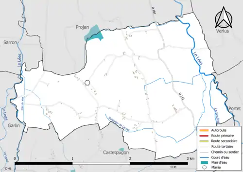 Les communes les plus proches[Note 2] sont[4] : Projan (2,0 km), Castetpugon (2,3 km), Sarron (3,6 km), Verlus (3,7 km), Portet (3,7 km), Garlin (3,9 km), Saint-Agnet (4,3 km), Baliracq-Maumusson (4,4 km).