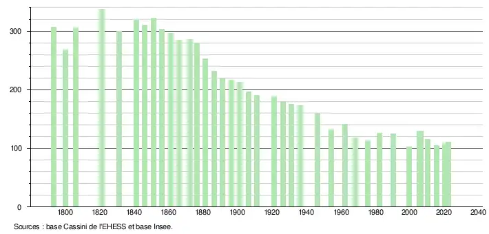 L'évolution du nombre d'habitants est connue à travers les recensements de la population effectués dans la commune depuis 1793. Pour les communes de moins de 10 000 habitants, une enquête de recensement portant sur toute la population est réalisée tous les cinq ans, les populations de référence des années intermédiaires étant quant à elles estimées par interpolation ou extrapolation[22]. Pour la commune, le premier recensement exhaustif entrant dans le cadre du nouveau dispositif a été réalisé en 2005[23].
