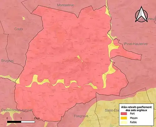 Le retrait-gonflement des sols argileux est susceptible d'engendrer des dommages importants aux bâtiments en cas d’alternance de périodes de sécheresse et de pluie[18]. La totalité de la commune est en aléa moyen ou fort (91,8 % au niveau départemental et 48,5 % au niveau national)[Carte 2]. Depuis le , en application de la loi ELAN, différentes contraintes s'imposent aux vendeurs, maîtres d'ouvrages ou constructeurs de biens situés dans une zone classée en aléa moyen ou fort[Note 1],[19].