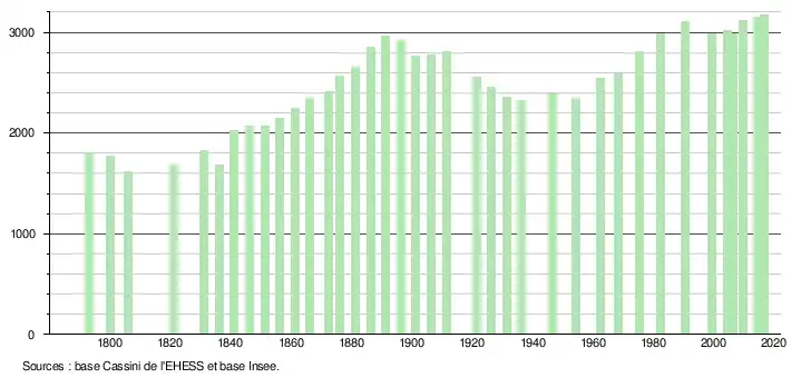 L'évolution du nombre d'habitants est connue à travers les recensements de la population effectués dans la commune depuis 1793. Pour les communes de moins de 10 000 habitants, une enquête de recensement portant sur toute la population est réalisée tous les cinq ans, les populations de référence des années intermédiaires étant quant à elles estimées par interpolation ou extrapolation[17]. Pour la commune, le premier recensement exhaustif entrant dans le cadre du nouveau dispositif a été réalisé en 2004[18].