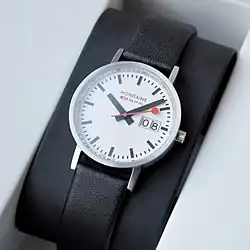 Mondaine Watch Ltd. fabrique et distribue dans le monde entier les montres officielles des Chemins de fer fédéraux suisses (CFF). Les acronymes CFF, SBB et FFS apparaissent sous le logo Mondaine, sur le cadran (SBB étant la traduction en allemand et FFS, la traduction en italien de l'acronyme CFF). Les montres Mondaine reprennent le cadran créé en 1944 par Hans Hilfiker[2],[3] pour équiper les 3 000 horloges des gares suisses. Avec la célèbre trotteuse rouge, qui reprend la forme ronde du panneau utilisé par le chef de gare pour donner le départ du train, Hans Hilfiker a créé un design intemporel[pas clair], moderne et lisible, qui et devenu une icône en Suisse et un symbole de la Suisse dans le monde. L'idée, révolutionnaire en 1944, était d'indiquer aux voyageurs présents sur le quai de la gare le temps restant avant le départ du train. Alimentées en électricité, ces 3 000 horloges ont la particularité d'être précises à la minute mais imprécises à la seconde. Trois raisons simples expliquent ce choix : premièrement, chaque gare comportant plusieurs horloges, chaque gare possède donc une horloge mère pilotant et synchronisant des “horloges filles” ou “horloges esclaves” pour indiquer une seule et même heure, identique, et pour n'avoir qu'une horloge à régler pour les régler toutes d'autant que, deuxièmement, l'électricité étant sujette à des variations de tension, il peut en résulter une imprécision. Afin de permettre à l'horloge de se resynchroniser, les ingénieurs ont donc décidé de faire tourner l'aiguille des secondes en 58,5 secondes (donc plus vite), puis de lui faire faire une pause de 1,5 seconde à chaque nouvelle minute[3]. Troisièmement, les départs des trains respectant une précision de l'ordre de la minute, si les horloges des gares suisses n'indiquent qu'au midi du cadran la seconde exacte, elles indiquent néanmoins fidèlement la minute, ce qui permet ce choix technique.
