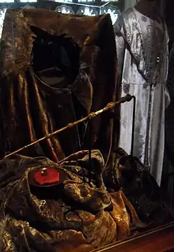 Les reliques de la Mort sont trois objets légendaires apparaissant dans le septième roman de Harry Potter. Leur symbole apparaît également dans le film Les Animaux fantastiques, sur le pendentif de Gellert Grindelwald, qui recherchait ces objets au début du XXe siècle avec Albus Dumbledore[56]. Ces trois reliques sont la baguette de sureau, la pierre de résurrection et la cape d'invisibilité.