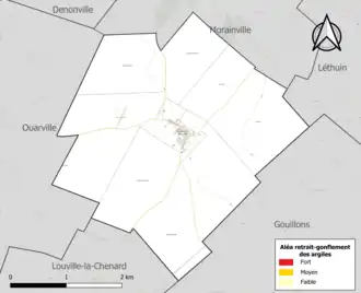 Le retrait-gonflement des sols argileux est susceptible d'engendrer des dommages importants aux bâtiments en cas d’alternance de périodes de sécheresse et de pluie. 0 % de la superficie communale est en aléa moyen ou fort (52,8 % au niveau départemental et 48,5 % au niveau national). Sur les 44 bâtiments dénombrés sur la commune en 2019, 0 sont en aléa moyen ou fort, soit 0 %, à comparer aux 70 % au niveau départemental et 54 % au niveau national. Une cartographie de l'exposition du territoire national au retrait gonflement des sols argileux est disponible sur le site du BRGM[15],[Carte 2].