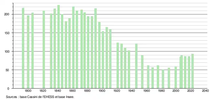 L'évolution du nombre d'habitants est connue à travers les recensements de la population effectués dans la commune depuis 1793. Pour les communes de moins de 10 000 habitants, une enquête de recensement portant sur toute la population est réalisée tous les cinq ans, les populations de référence des années intermédiaires étant quant à elles estimées par interpolation ou extrapolation[23]. Pour la commune, le premier recensement exhaustif entrant dans le cadre du nouveau dispositif a été réalisé en 2007[24].