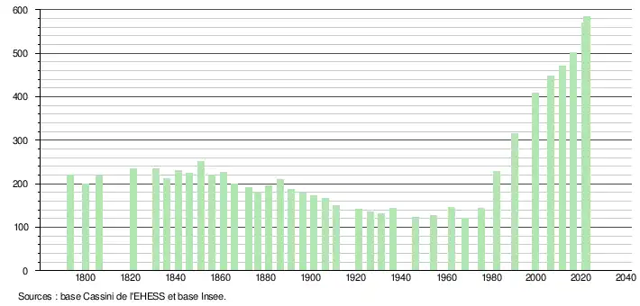 L'évolution du nombre d'habitants est connue à travers les recensements de la population effectués dans la commune depuis 1793. Pour les communes de moins de 10 000 habitants, une enquête de recensement portant sur toute la population est réalisée tous les cinq ans, les populations de référence des années intermédiaires étant quant à elles estimées par interpolation ou extrapolation[32]. Pour la commune, le premier recensement exhaustif entrant dans le cadre du nouveau dispositif a été réalisé en 2006[33].