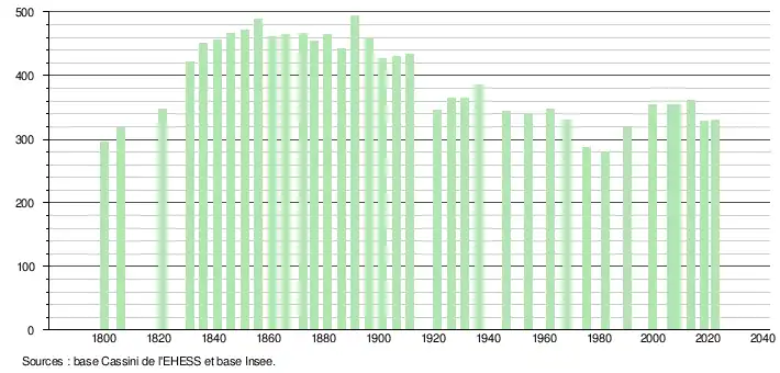 - ↑ Fiches Insee - Populations de référence de la commune pour les années 2006, 2007, 2008, 2009, 2010, 2011, 2012, 2013, 2014, 2015, 2016, 2017, 2018, 2019, 2020, 2021 et 2022.