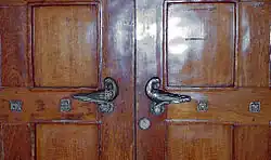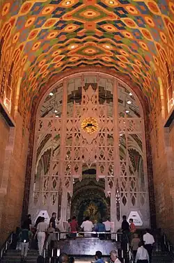 Le métal monel s'expose à l'intérieur de la cathédrale Bryn Athyn, siège de l'en:General_Church_of_the_New_Jerusalem Église de la Nouvelle Jérusalem en Pennsylvanie, en particulier par de nombreux panneaux décoratifs, les poignées de porte, etc.
