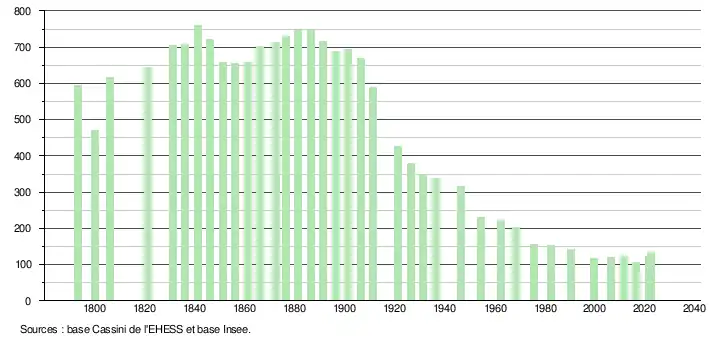 L'évolution du nombre d'habitants est connue à travers les recensements de la population effectués dans la commune depuis 1793. Pour les communes de moins de 10 000 habitants, une enquête de recensement portant sur toute la population est réalisée tous les cinq ans, les populations de référence des années intermédiaires étant quant à elles estimées par interpolation ou extrapolation[21]. Pour la commune, le premier recensement exhaustif entrant dans le cadre du nouveau dispositif a été réalisé en 2006[22].