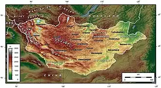 Une partie du pays est constituée de steppes. La désertification touche 140 000 des 1 565 500 km2[7]. Le désert de Gobi recouvre une partie du sud du pays, alors qu'au nord et à l'ouest, se trouvent des régions montagneuses aux forêts abondantes.