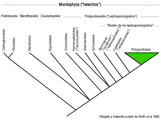 Le système de classification de 2006 a été proposé par Smith et al. à la lumière des progrès récents de la phylogénie des monilophytes. C'est une classification phylogénétique et non morphologique, donc dans certains nœuds, il est encore difficile de dire quels sont les caractères morphologiques qui caractérisent chaque clade. Beaucoup de ses nœuds sont déjà reconnus comme phylogénétiques, principalement en ce qui concerne les eusporangiés et les nœuds basaux des leptosporangiés. Ils reconnaissent que la recherche fait encore défaut, en particulier au niveau du genre. Bien que les genres continuent de muter à cause de cela, la classification jusqu'au niveau de la famille peut déjà être considérée comme phylogénétique.