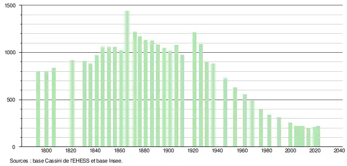 L'évolution du nombre d'habitants est connue à travers les recensements de la population effectués dans la commune depuis 1793. Pour les communes de moins de 10 000 habitants, une enquête de recensement portant sur toute la population est réalisée tous les cinq ans, les populations de référence des années intermédiaires étant quant à elles estimées par interpolation ou extrapolation[24]. Pour la commune, le premier recensement exhaustif entrant dans le cadre du nouveau dispositif a été réalisé en 2004[25].
