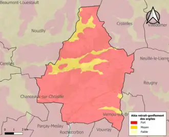 Le retrait-gonflement des sols argileux est susceptible d'engendrer des dommages importants aux bâtiments en cas d’alternance de périodes de sécheresse et de pluie. La totalité de la commune est en aléa moyen ou fort (90,2 % au niveau départemental et 48,5 % au niveau national). Sur les 1 627 bâtiments dénombrés sur la commune en 2019, 1626 sont en aléa moyen ou fort, soit 100 %, à comparer aux 91 % au niveau départemental et 54 % au niveau national. Une cartographie de l'exposition du territoire national au retrait gonflement des sols argileux est disponible sur le site du BRGM[22],[23].