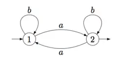Le monoïde des transitions de l'automate ci-contre a deux éléments : l'identité sur et la permutation qui échange et . Les mots contenant un nombre pair de lettres ont pour image l'identité, les autres la permutation . Le monoïde syntaxique est le groupe des entiers modulo .